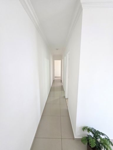 Piso em porcelanato e moldura de gesso em todos os cômodos;
