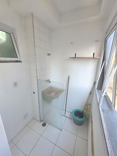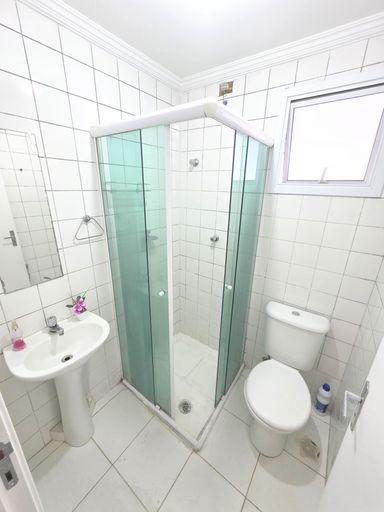 Banheiro com box de vidro, pronto para uso.