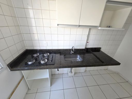 Cozinha equipada com pia de mármore, fogão cooktop, balcão e armário aéreo;